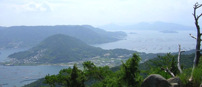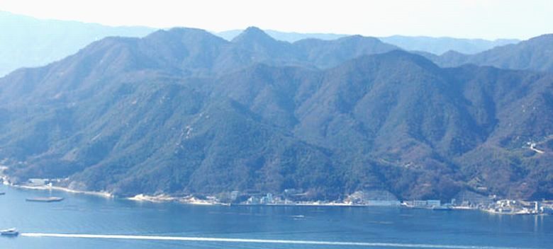 | 眺め! 頂上からの風景 前方は津久茂地区、山の向こうは津久茂瀬戸、左向こうは沖見町、 右遠くは厳島(宮島) | |