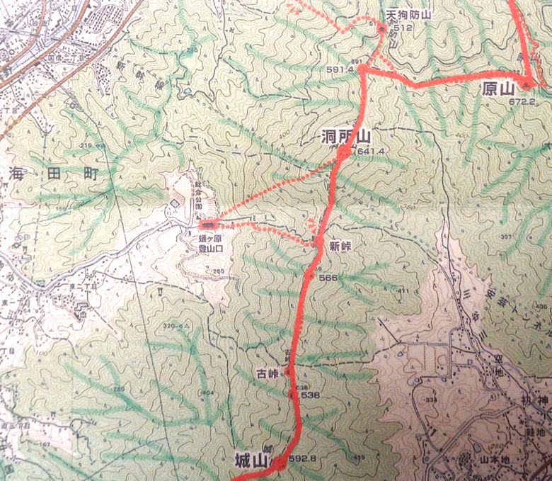 洞所山(641.4m)は海田町と熊野町の境界に位置しする安芸アルプス(鉾取山系)の南から3番の山です。海田町総合公園に抜ける 新峠(しんたお)があり、昔は熊野〜海田町方面に多くの人が利用していた。明治の境界標識が見られ日清戦争時に軍部機能を果たして設置されたと言われている。 |