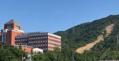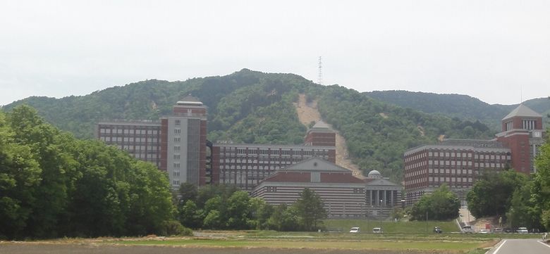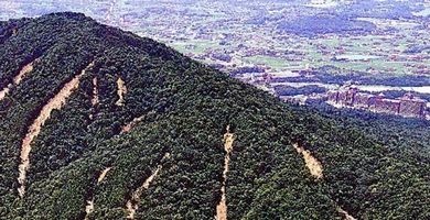 | 前平山の山崩れ(平成30年) ( 国際大学の前方の山) | 前平山南側から (右遠くに国際大学が見える ) |