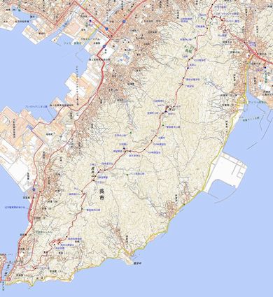 | 休山連山の地図 | 三津峰山(八咫烏山)の拡大図 三津峰山から高烏山間,約600mの山道(歩道)あり |