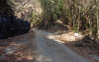 | 山道(アスファルト)から登山道(右)へ (左の土嚢は土砂崩れの跡…2022現在修復されている) | |