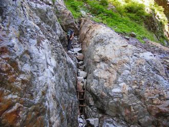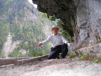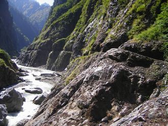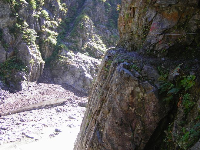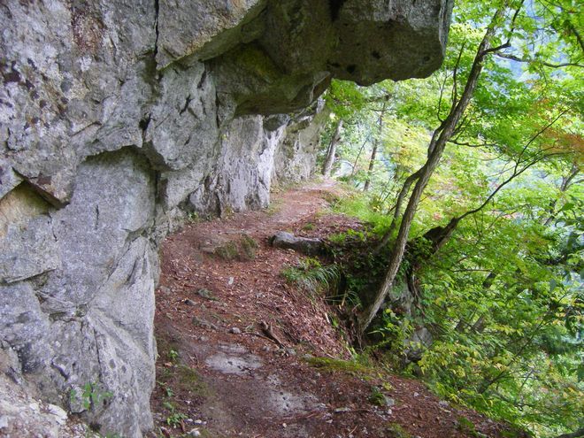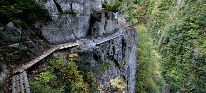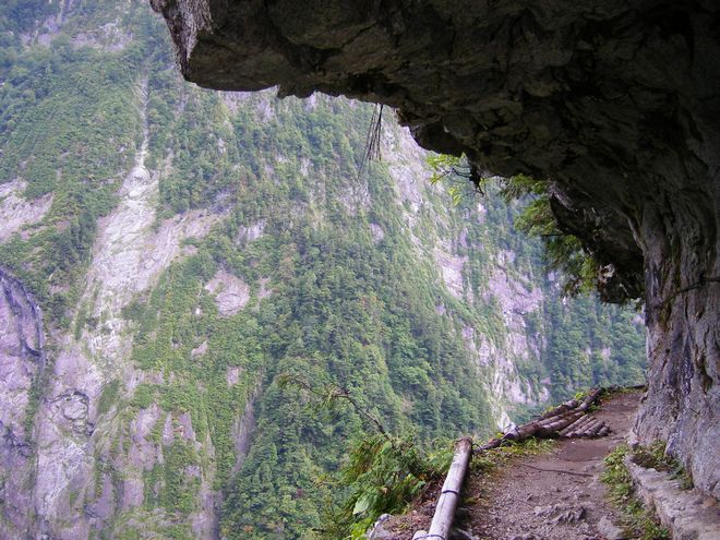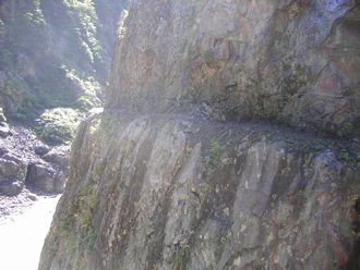 | 垂直の絶壁をコの字型に切り抜いた水平歩道 右側は断崖絶壁で植物はたくましく育っています |