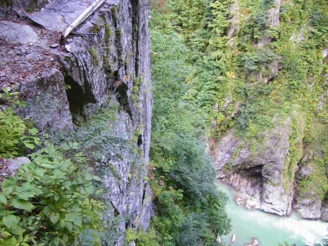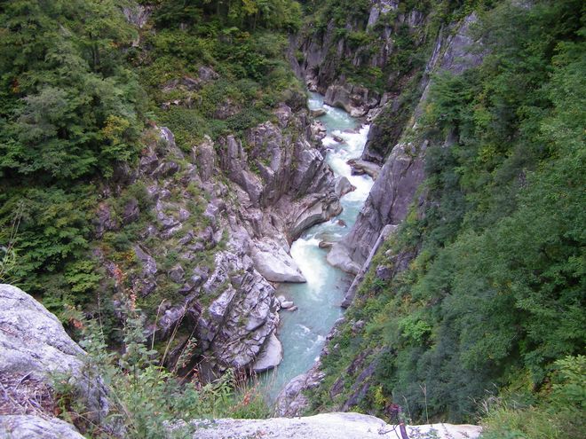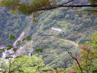 | 谷底(黒部川)、200m あろうかと思われる断崖絶壁です ダム建設資材を運ぶためこの道を多くの人が通っていました |