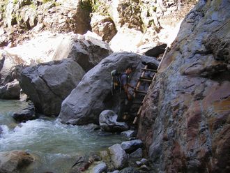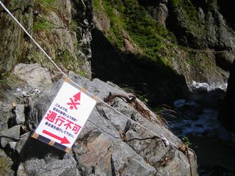 | 雪渓が不安定で通行止め…このため歩道からロープで約50m下の川原に降りる | ||