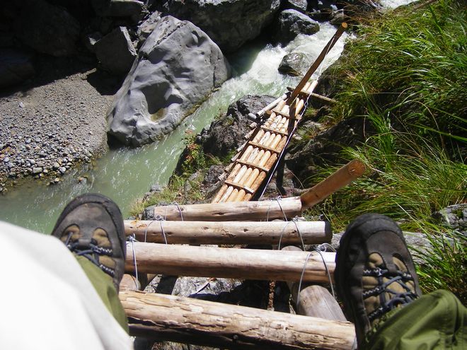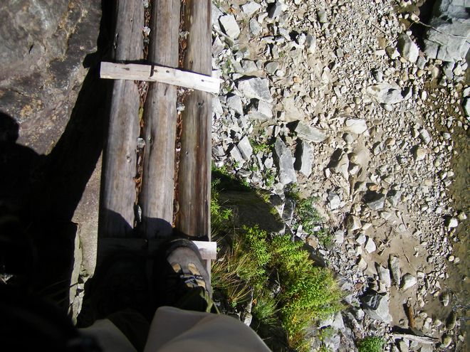 | ここは丸太を束ねた幅だけ…命綱は針金2本… (手前は私の靴です) | ||