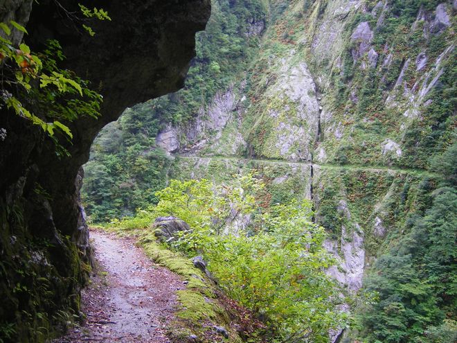 | 阿曽原小屋を登ると 水平歩道に入る 欅平までの水平歩道は「黒部川第3発電所」 の建設資材の運搬に利用されていた |