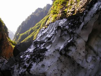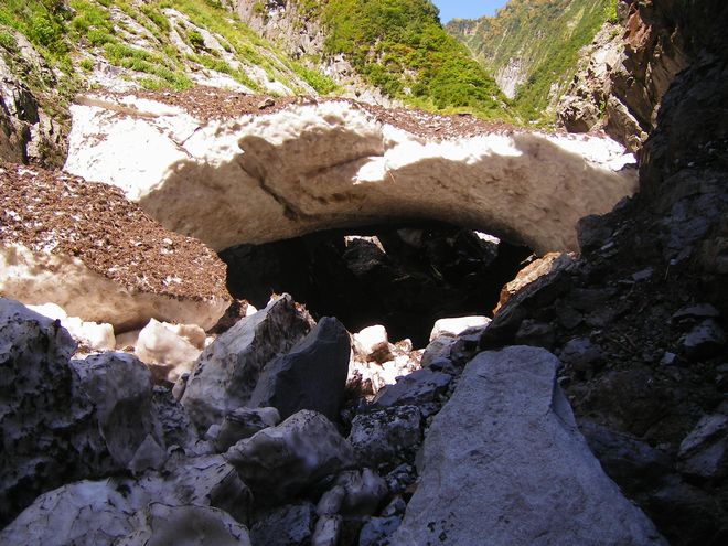 | 通常この雪渓(万年雪)上を通るが今年は危険なので黒部川の川原迂回となる ( 解け始めた雪渓に、あと一ヶ月余りで雪が降り始めます ) |