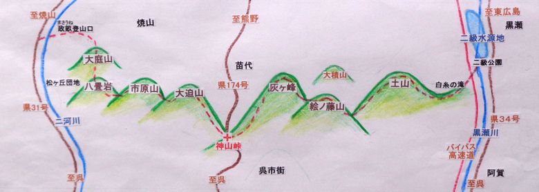 このルート(16.4 ㎞)は、呉市焼山から広町二級峡までになります。灰ヶ峰までは登り道、二級峡方面は下り坂となっています。灰ヶ峰からの景観は呉市街と呉港休山が見渡せ、終点の二級峡公園はハイキングの疲れをいやす場所として最適です。 環境庁広島県