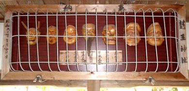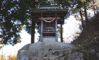 | 南側の登山口にある 竜王神社 (萩原神社) | 竜王神社(萩原神社)に奉納されている お面 |
