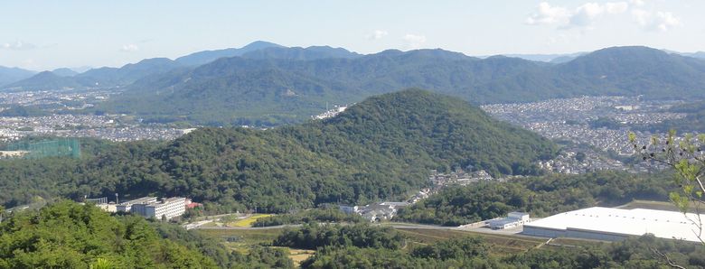 | 大平山 と 小平山 左の建物は 「昭和高校」 右の白い建物はエコグローブ (ゴミ最終処分場) 山の神山から撮影 | ||