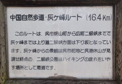 | 大庭山(おおばんやま)は呉市焼山の住宅団地に囲まれ、3等三角点の置かれた山です。 登山道は中国自然歩道として整備され、周囲は市民の憩いの場となっています。 山頂岩下の大庭神社からは焼山や熊野の素晴らしい風景が望め政畝(まさうね)団地登山口 から約20分で到着でき散歩コースとしても利用されています。 更に運動量が必要なら中国自然歩道を東に進み八畳岩そして灰ヶ峰へと続きます。 中国自然歩道 灰が峰ルート(16.4km) 焼山〜 大庭山 ↔ 八畳岩 ↔ 市原山 ↔ 大迫山 ↔ 灰ヶ峰 ↔ 江ノ藤山 ↔ 土山 〜 広(二級峡) |